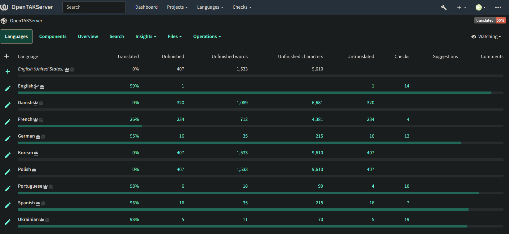 To view the status of supported languages, browse to https://weblate.opentakserver.io and click on OpenTAKServer. All supported languages, their percentage of completion, and the translations themselves can be viewed without logging in.